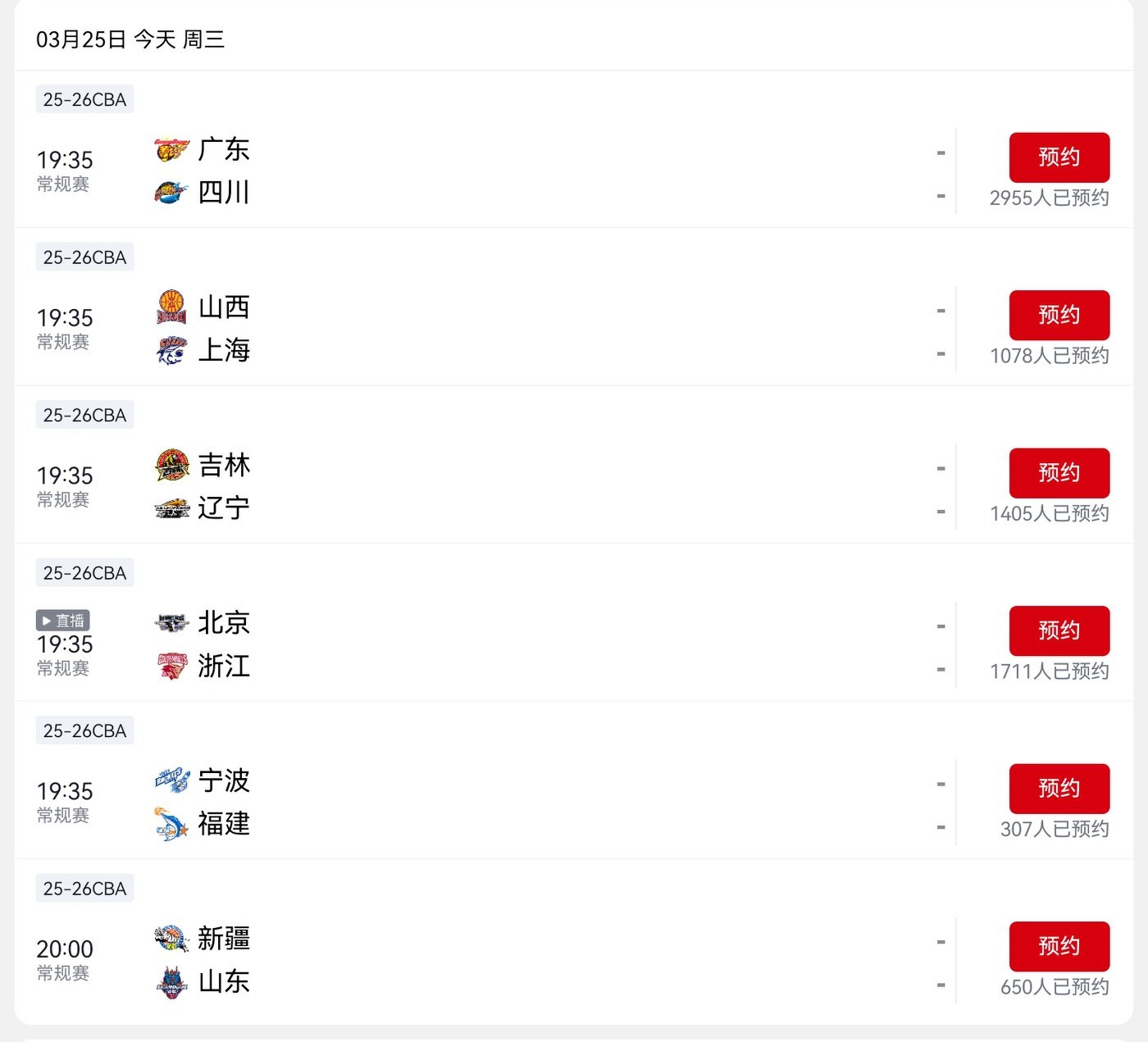 According to the officially released schedule, there are six games scheduled for today's CBA regular season, details as shown in the image below.