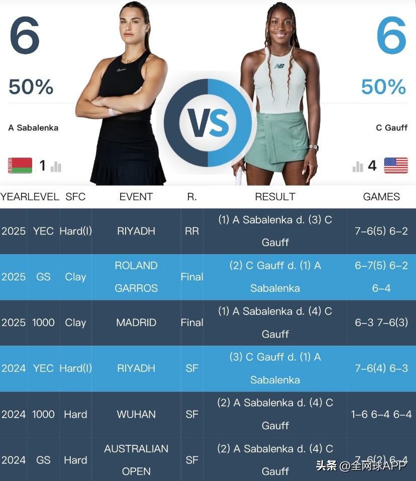 The finalists are well acquainted. In their 12 previous career encounters, each has won six, making it a deadlock. Their earliest duel dates back to 2020 at the WTA250 Lexington event—the first tournament to resume post-pandemic—where the 16-year-old Gauff battled through three sets, 7-6(4)/4-6/6-4, to defeat Sabalenka, who was then ranked No. 11.