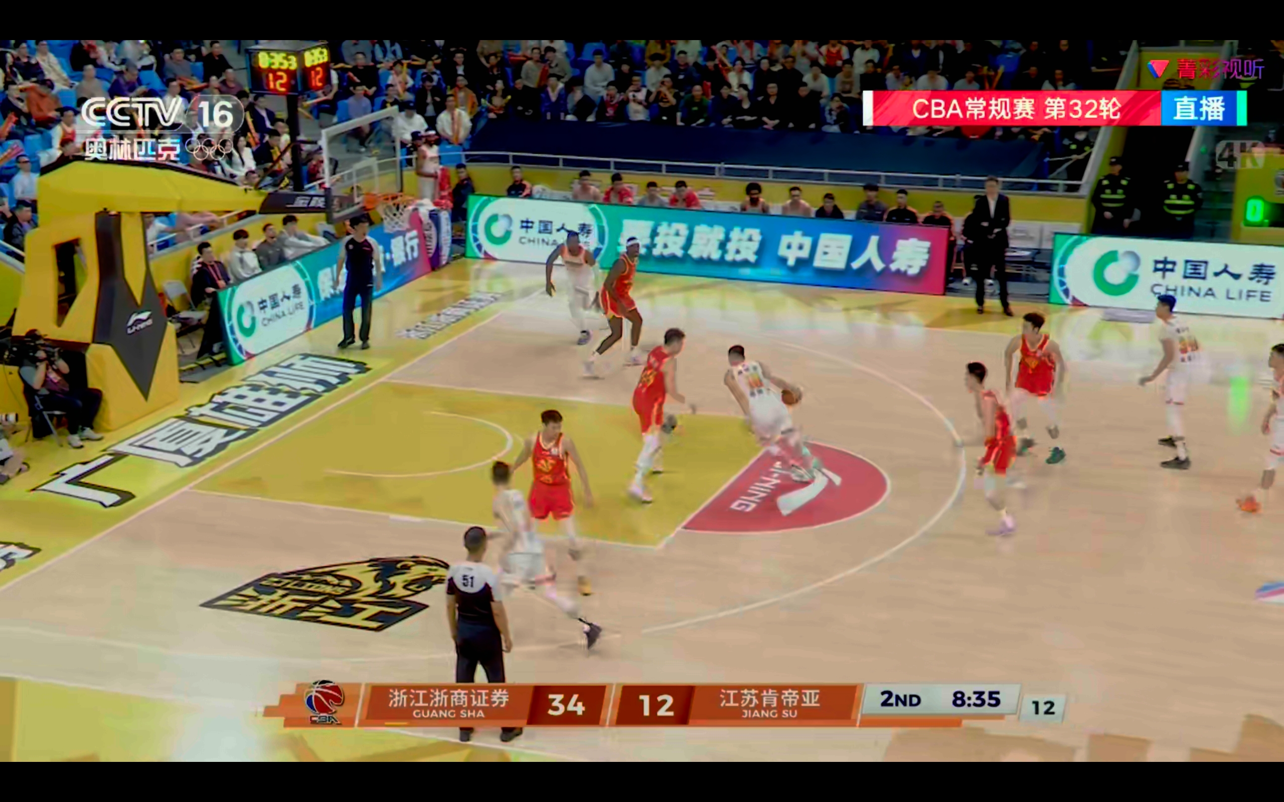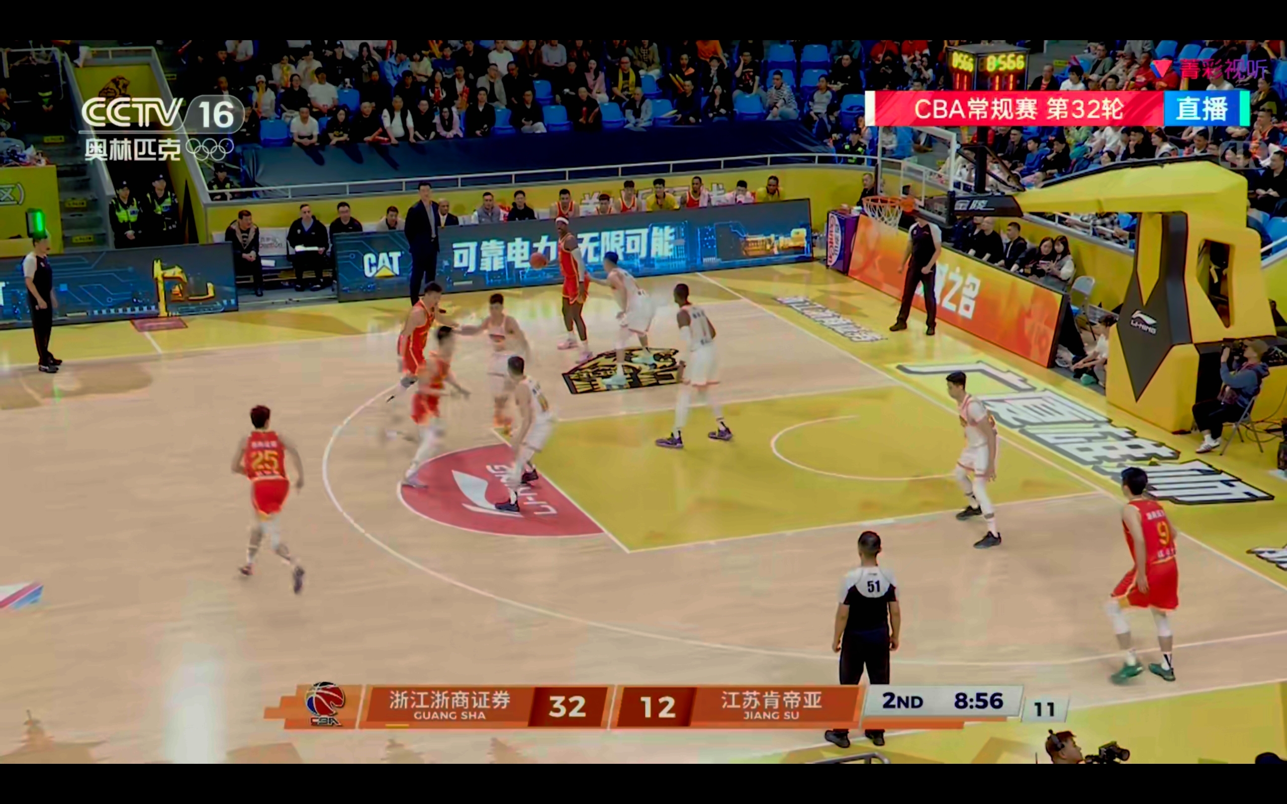 #头条创作训练营#CCTV-16 Olympic Channel is broadcasting the 32nd round of the CBA regular season featuring Zhejiang Zhejiang Securities versus Jiangsu Kendia.