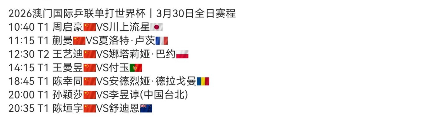 #头条创作训练营#Table Tennis World Cup schedule tomorrow (2026.3.30): Sun Yingsha, Wang Manyu, Chen Xingtong, Kuai Man, Zhou Qihao, and 7 others to compete; live broadcast on CCTV-5 and Migu Video.
