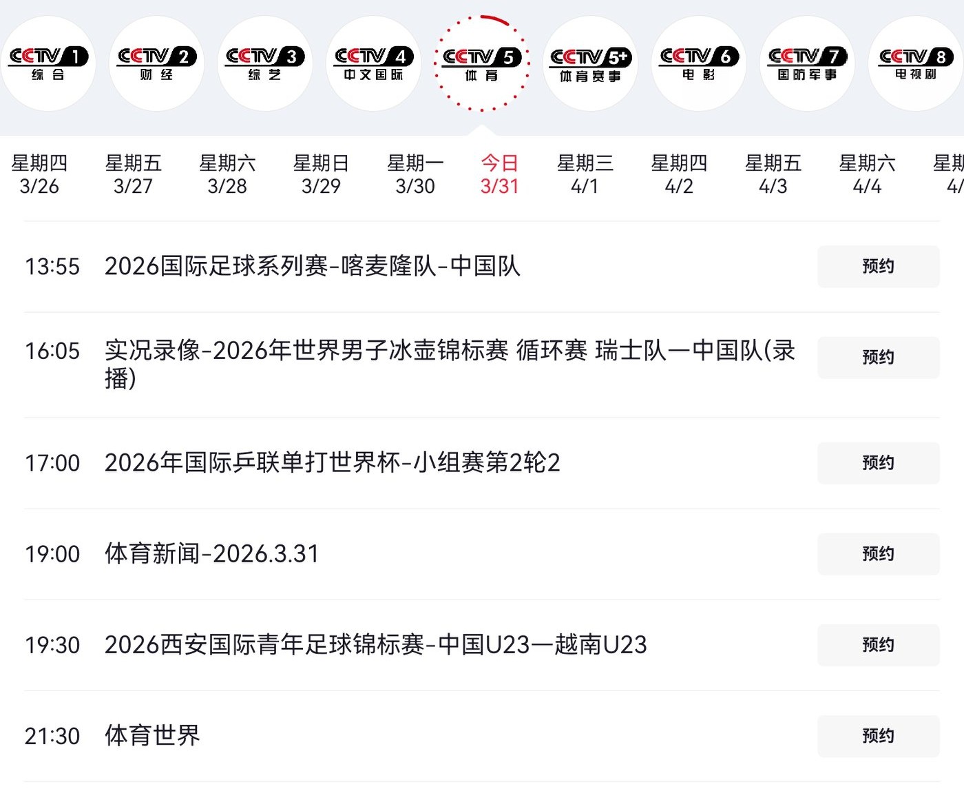 1. At 2 PM today, China's men's football team vs. Cameroon's men's football team,CCTV-5 will begin live coverage at 1:55 PM.