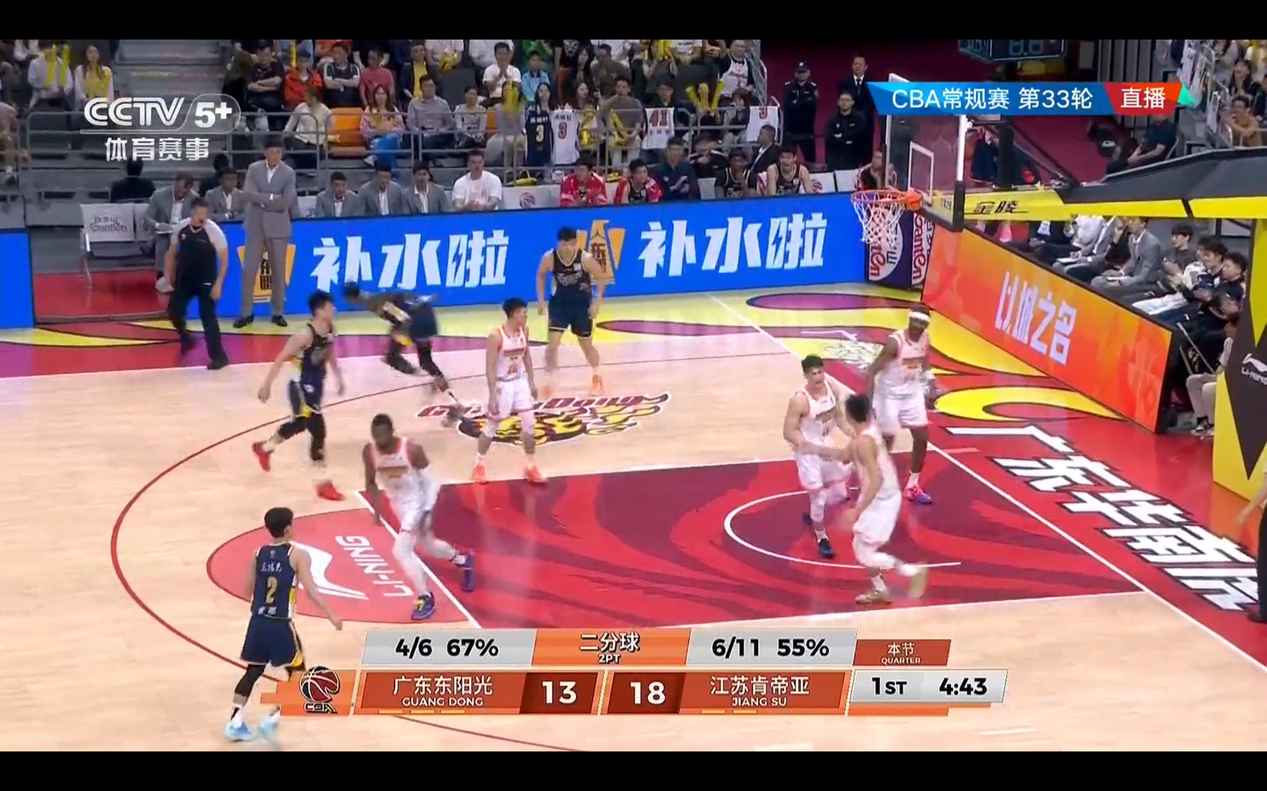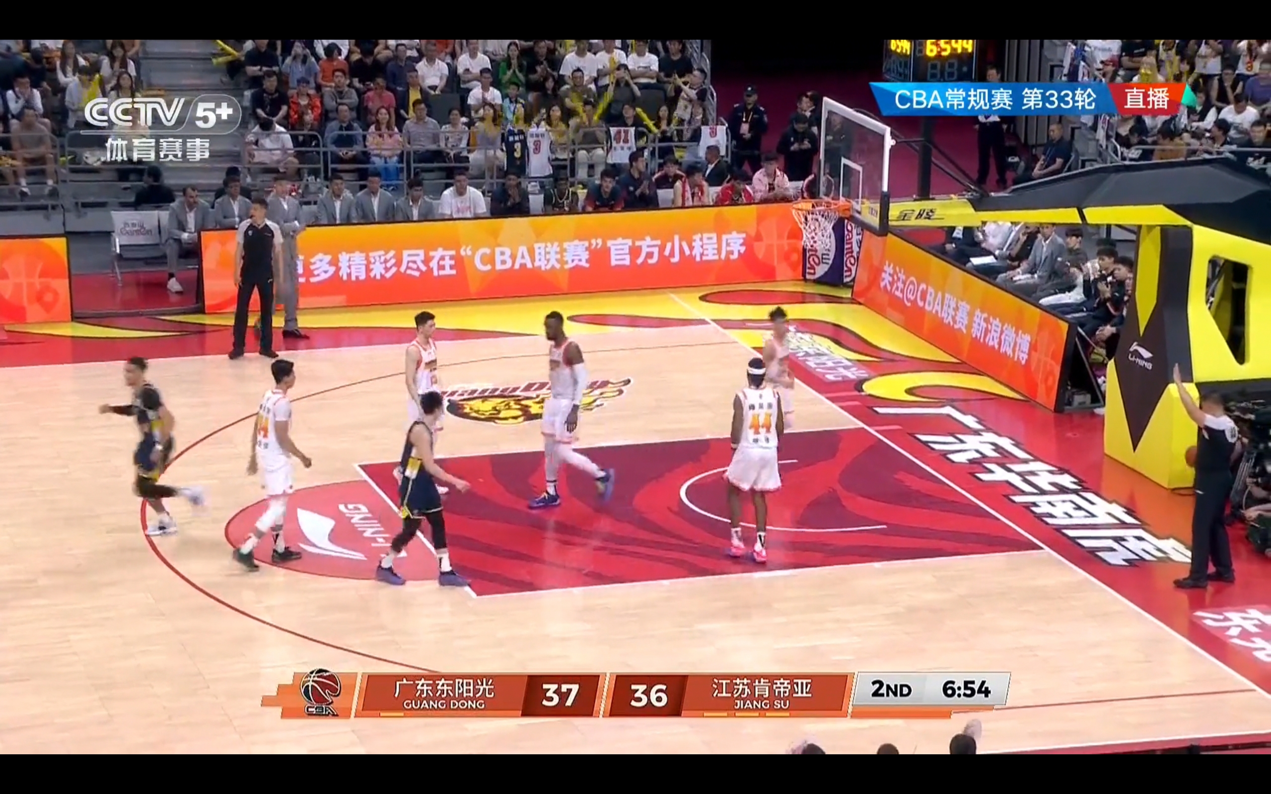 The game has now reached the second quarter, with Guangdong Dongguan Guangsha leading Jiangsu Kendia 37-36.