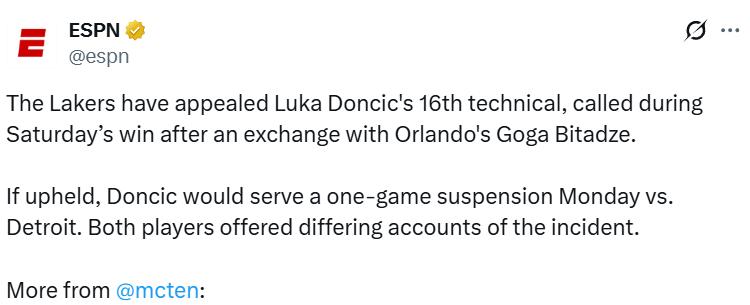 This is Doncic's 16th technical foul this season. If this foul is not rescinded, according to the rules, he will automatically be suspended for one game in the Lakers' upcoming match against the Pistons on Tuesday due to accumulating 16 technical fouls.