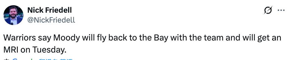 On March 24 Beijing time, Warriors reporter Friedel reported that Moody underwent an X-ray examination after the game. The 23-year-old player currently has a stabilizing brace on his knee. He also stated that Moody will fly back to the Bay Area with the Warriors and undergo an MRI scan tomorrow.