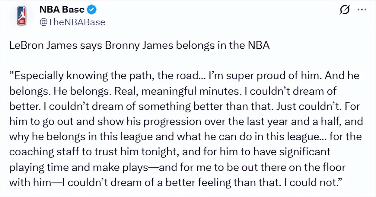 “This was real, meaningful playing time; there’s no better outcome than this, truly no better,” James said. “He stepped onto the court, I mean obviously he… Over this past year and a half, his progress has been evident. It also proves why he deserves to play in this league and what he can achieve here. So, the coaching staff trusted him tonight, gave him significant minutes, and let him execute some excellent plays—andbeing able to stand on the court alongside him, that feeling… there’s truly nothing better, really nothing.”