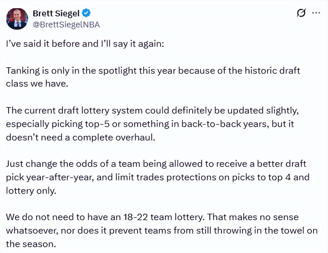 On March 27 Beijing time, according to prominent reporter Shams, ESPN sources revealed that the NBA submitted three comprehensive anti-tanking reform proposals to the league's board of governors yesterday. Each proposal is expected to be adjusted before the official vote in May. After the three proposals were exposed, they quickly sparked heated discussion,journalist Siegel criticized these proposals as garbage.
