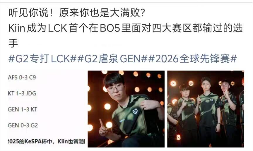 As Kiin faced widespread criticism, many viewers noticed that Kiin has now become a grand loser across all five major regions. In earlier years, Kiin lost to team C9; last year in the K Cup, he lost to Vietnamese and other wildcard teams; and this year in the global Pioneer Tournament, he lost to team G2. Kiin has now lost to teams from all five major regions. It must be said that Kiin's luck is quite good, as having Chovy in the team draws away attention. Whenever GEN loses, Kiin can quietly evade blame. (What do you think about Kiin's individual skill? In annual K Cups without Chovy and Ruler, Kiin-led GEN even struggles against some wildcard teams.)