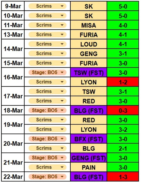 G2’s two sweeps against Korean teams in the actual tournament were not coincidental. G2 scheduled one scrim against BFX and two against GEN, almost all being dominant victories. Against BFX, they swept 3-0; against GEN, they played two BO5 scrims, winning one 3-1 and the other 3-0. Clearly, G2 dominated Korean teams in scrims.