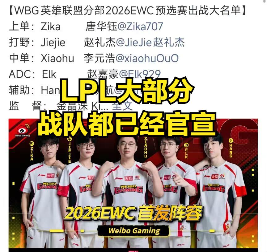 At the same time, the LPL official organization is about to hold the Esports World Cup selection tournament. Many LPL teams have released their participant rosters for this selection event on their official social media accounts. Many viewers believe these rosters likely represent the core framework for each team's second phase. Notably, elite teams like WBG, BLG, IG, AL, and TES are all participating with their main squads. Among these top teams, except for BLG and JDG, all others have made personnel adjustments during the transfer period.
