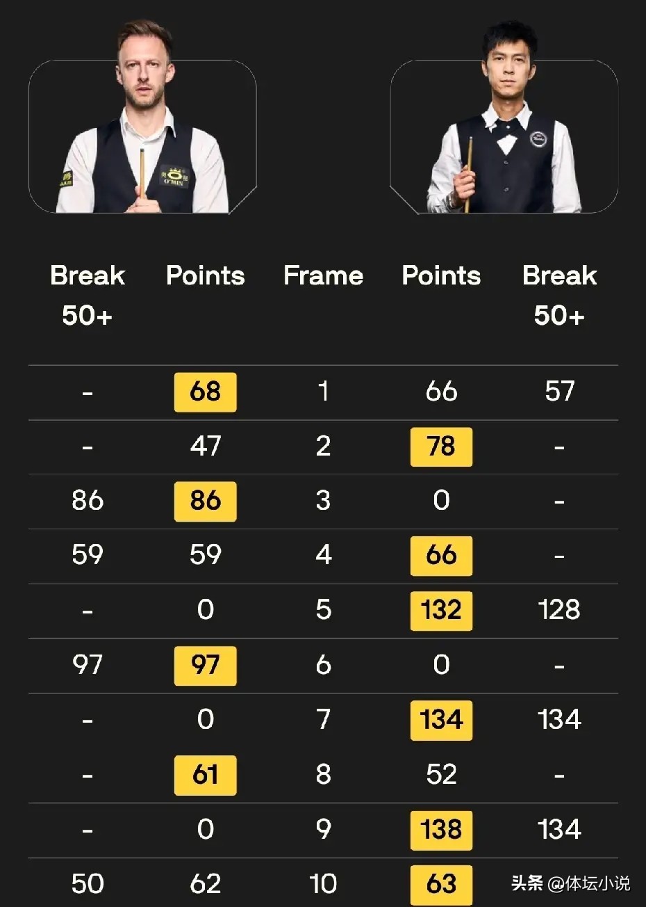 Trump faced Thaksin. Trump, world number one, won the German Masters this season and steadily reached the semi-finals here. His semi-final opponent Thaksin, generally considered average with only accuracy as a trait, made Trump the favored winner. The match was intensely competitive, essentially alternating frames. After eight frames, it was 4-4. Crucially, in frame nine, Thaksin blasted a 134-point century break to take a 5-4 match lead, pushing Trump to the brink. In frame ten, Trump scored a 50-point break but didn't secure the frame; Thaksin accumulated points steadily and, under pressure, potted the decisive black for a 63-62 dramatic win, eliminating Trump 6-4 and stunningly entering the final as the event's biggest dark horse!