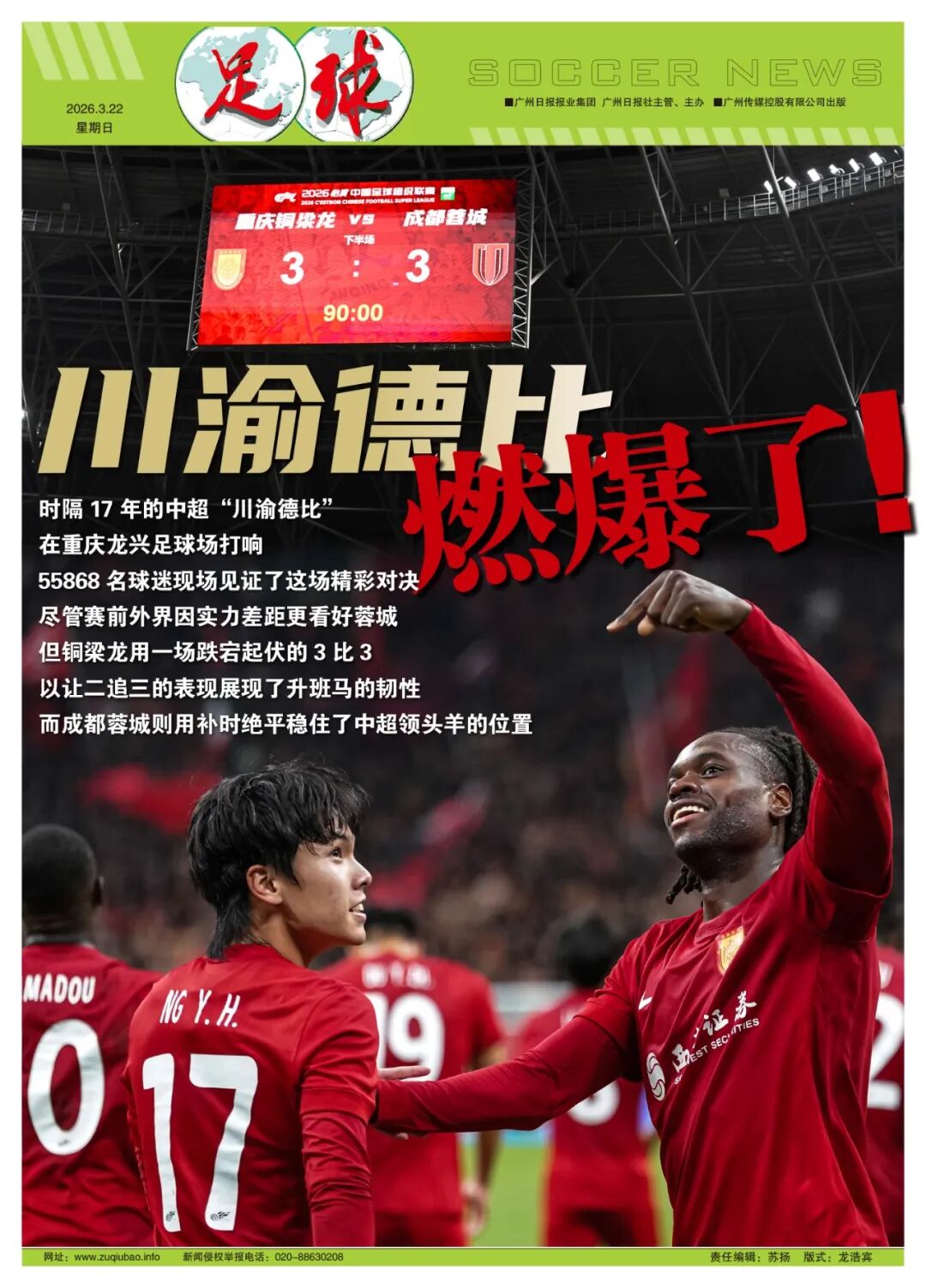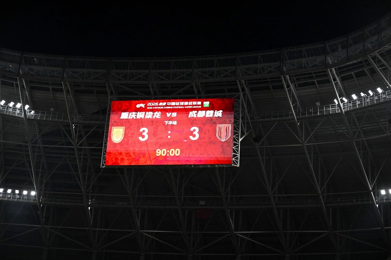 Journalist Lu Mi reported. On the evening of March 21, the Chinese Super League's "Sichuan-Tibet Derby," after a 17-year hiatus, kicked off at Chongqing Longxing Football Stadium. The newly promoted Chongqing Tongliang Dragons hosted Chengdu Rongcheng, with 55,868 fans witnessing this thrilling match live. Despite pre-match expectations favoring Rongcheng due to perceived strength disparity, Tongliang Dragons showcased the tenacity of a newly promoted team with a roller-coaster 3-3 draw, demonstrating a comeback from two goals down. The departure of Rongcheng's foreign player Silva became the critical turning point of this match.
