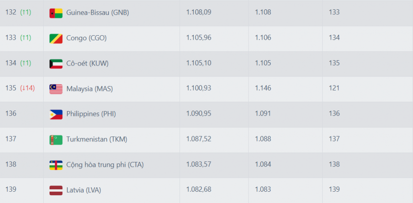 On the contrary, Malaysia's national team suffered a significant drop in ranking. After being penalized with losses in two matches, the "Malayan Tigers" have fallen 14 places to the 135th position with 1,146 points. Previously, they held the 121st spot, which now belongs to Indonesia after the archipelago nation's team slightly climbed one place in the latest update.
