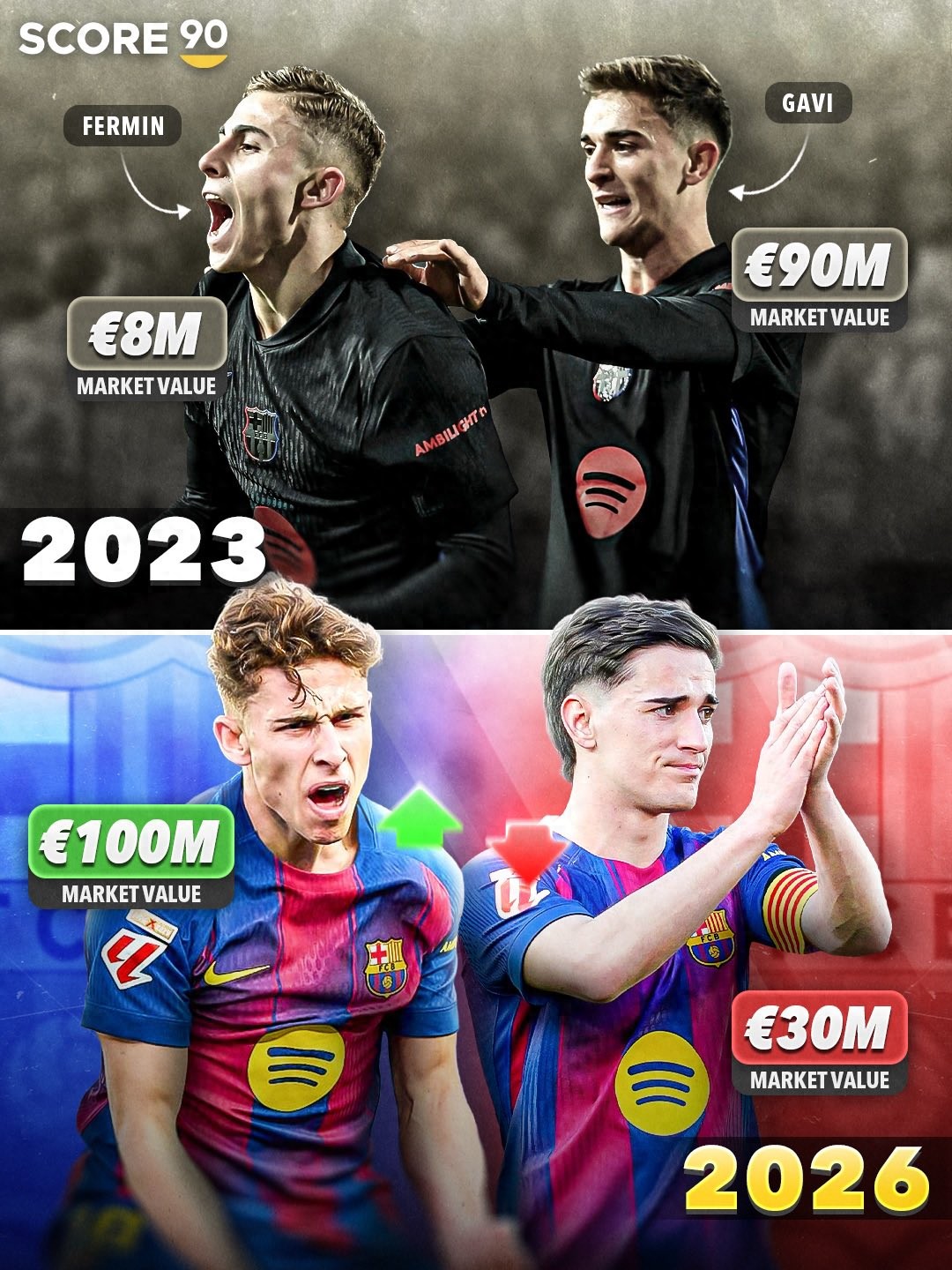 Both Fermín and Gavi come from La Masia youth academy, so they have been teammates since childhood. In 2021, then 17-year-old Gavi burst onto the scene at Barcelona, quickly becoming a key midfielder for the team; Fermín only joined Barcelona's first team in 2023 when he was 20 years old. At that time, Gavi's value had already reached €90 million, and most fans and media believed Gavi would become Barcelona's new "€100 million man," while Fermín's value was only €8 million.