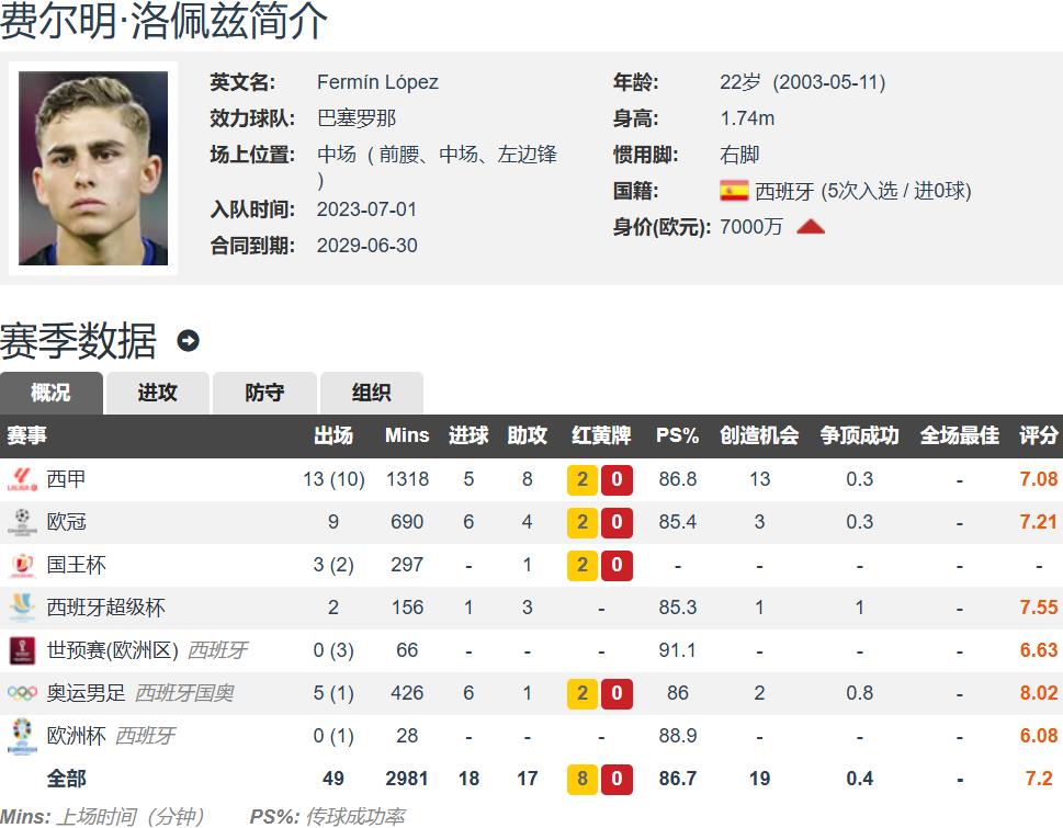 Meanwhile, Fermín progressed steadily, step by step becoming an important attacking midfielder for Barcelona. This season, he has delivered consistent output, with 12 goals and 16 assists in 39 matches across all competitions, achieving near double-digit figures early and setting a new personal career record for goal contributions. His value has multiplied 12.5 times over three years, soaring from €8 million to €100 million, now one of La Liga's eight €100 million players.