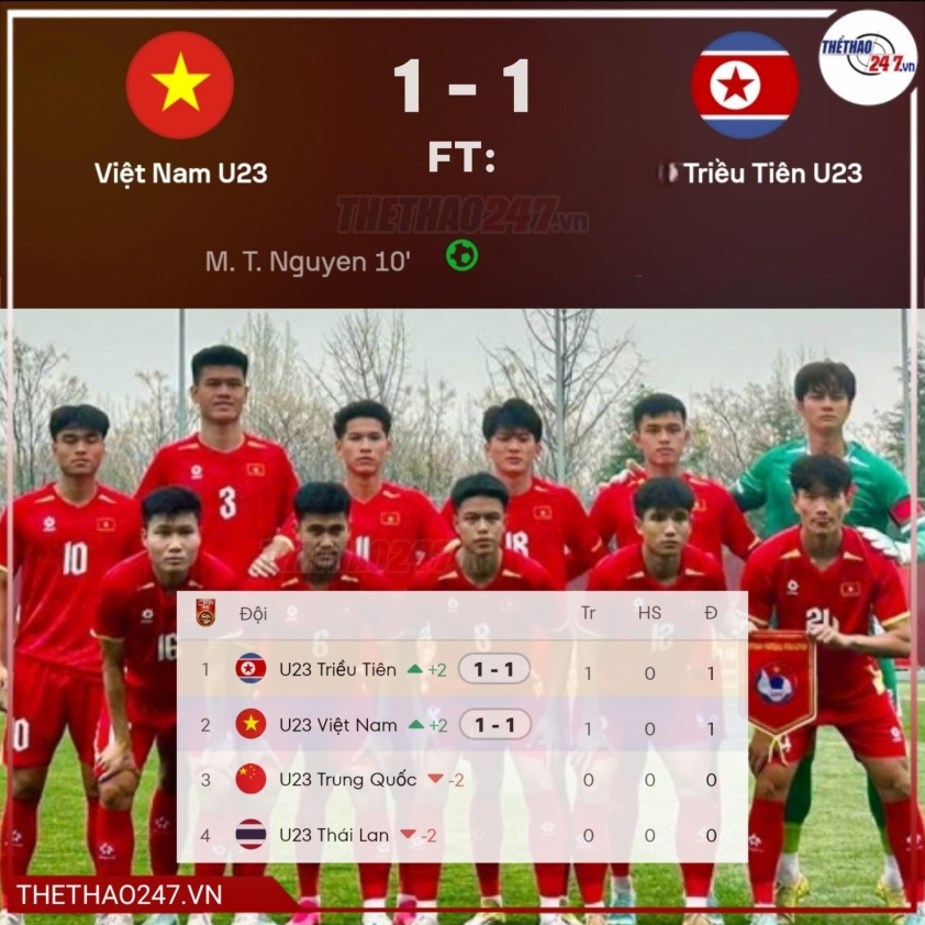 In this match, Vietnam U23 started enthusiastically and quickly scored the opening goal in the 8th minute thanks to Minh Tâm. However, after the break, the red-shirted team proactively slowed down, allowing North Korea U23 to increase pressure and find the equalizer in the 79th minute, thus ending the match with a 1-1 draw.