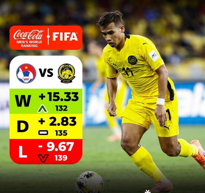 According to NST, the 1-3 defeat against the Vietnamese national team along with related penalties directly caused Malaysia to drop three places, from position 135 to 138. However, this loss is only part of the chain of reasons leading to the Southeast Asian team's decline.