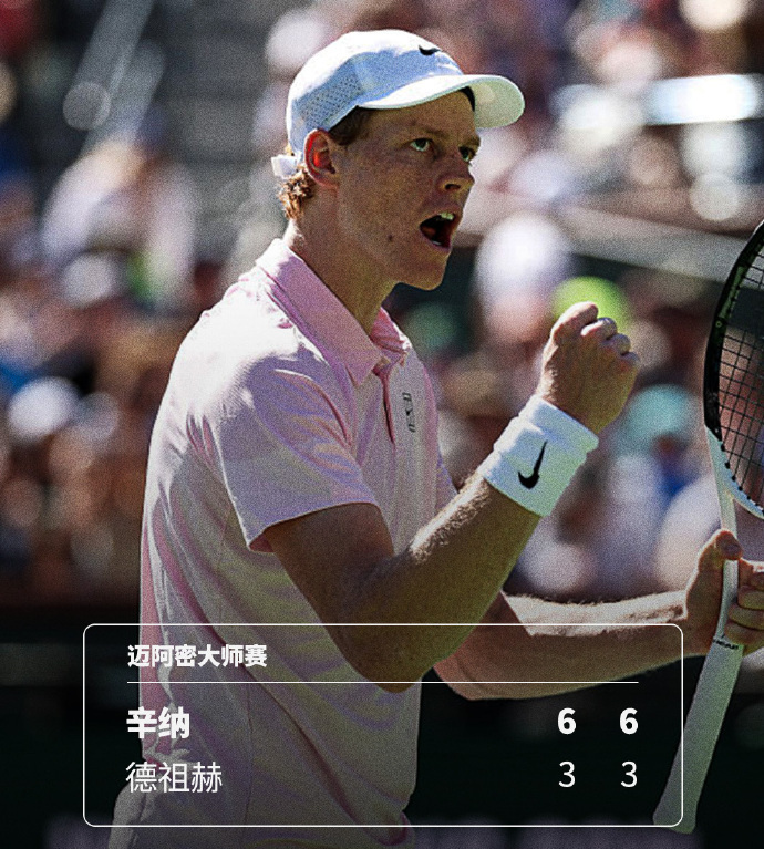 This morning Beijing time, in a key match of the ATP1000 Miami Masters singles second round, the world No. 2 Sinner, making his debut, performed steadily, defeating Bosnian player Dzumhur 6-3 6-3, advancing smoothly. After this win, Sinner also equaled a record held by Serbian tennis king Djokovic: the consecutive winning sets streak (24 sets) in ATP1000 Masters series, tying for first place.