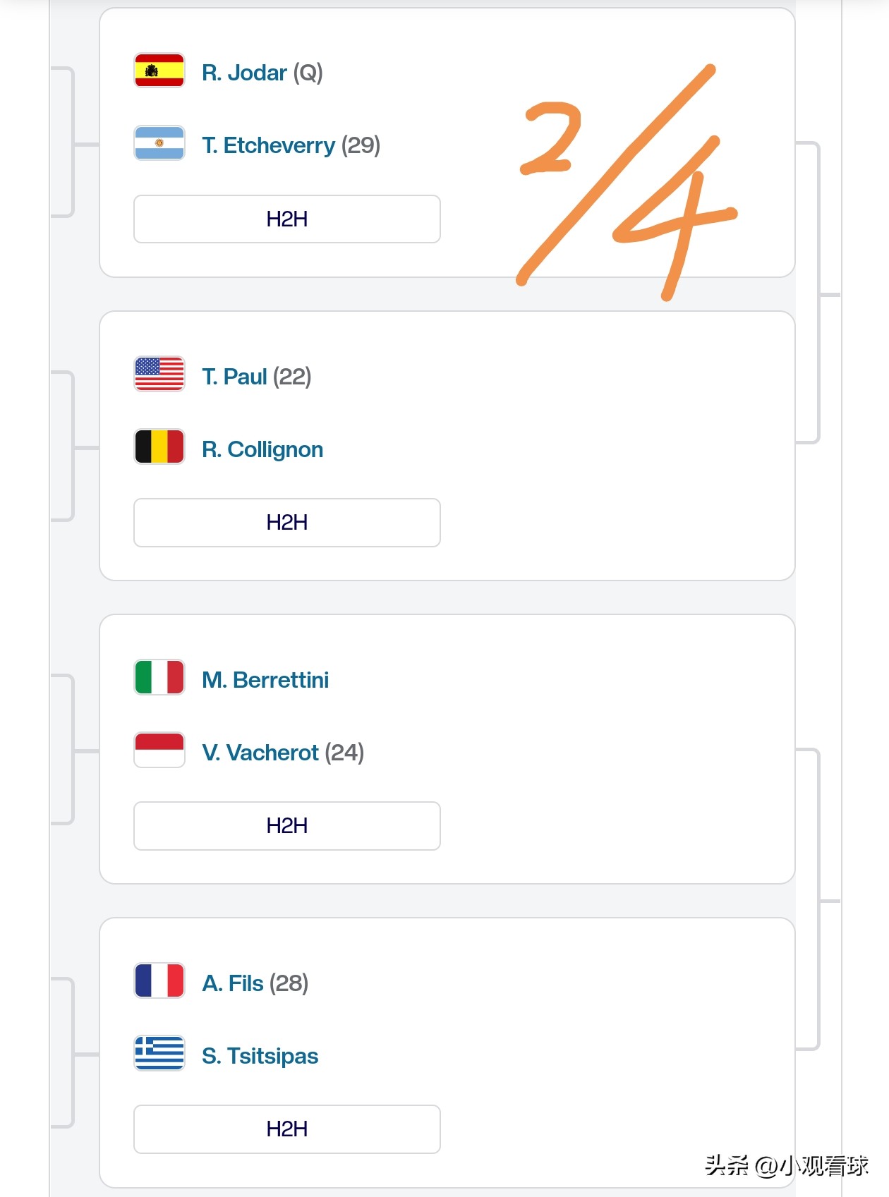 1. Fils vs. Tsitsipas (Quarter 2): The peak showdown between the new generation and the established star. Whether the overwhelming head-to-head advantage will continue is the biggest看点 of this round, and a crucial battle for the rising star to prove himself.