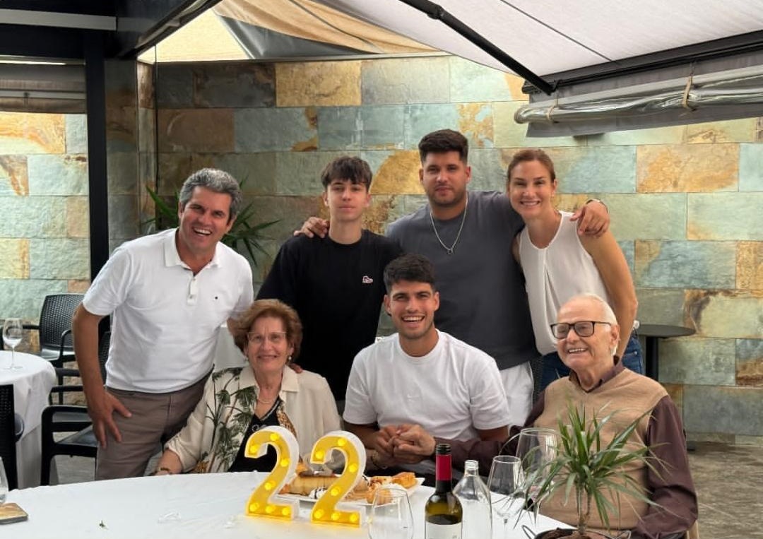 An "Alcaraz" family gathering, back row left first is Old Carlos, back row left second is Third Alcaraz, back row left third is Big Alcaraz, front row center is Alcaraz.