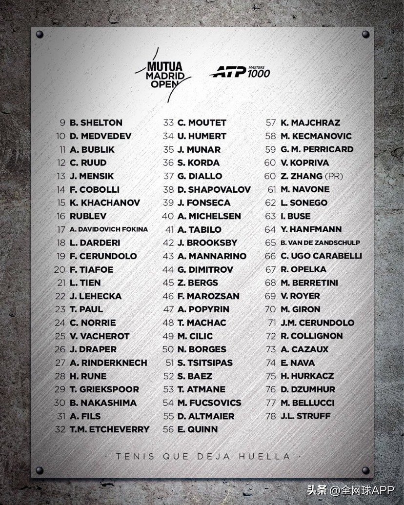 Ruud will embark on his title defense; last year in Madrid, he defeated three top-10 players—Fritz (No.4), Medvedev (No.10), and Draper (No.6)—to claim his first Masters title. Former champions Djokovic, Zverev, and Rublev are also on the list. Danish star Rune, sidelined by injury for nearly half a year, has entered and may return to competition in Madrid. The current cutoff for the main draw is No.75 former finalist Struff.