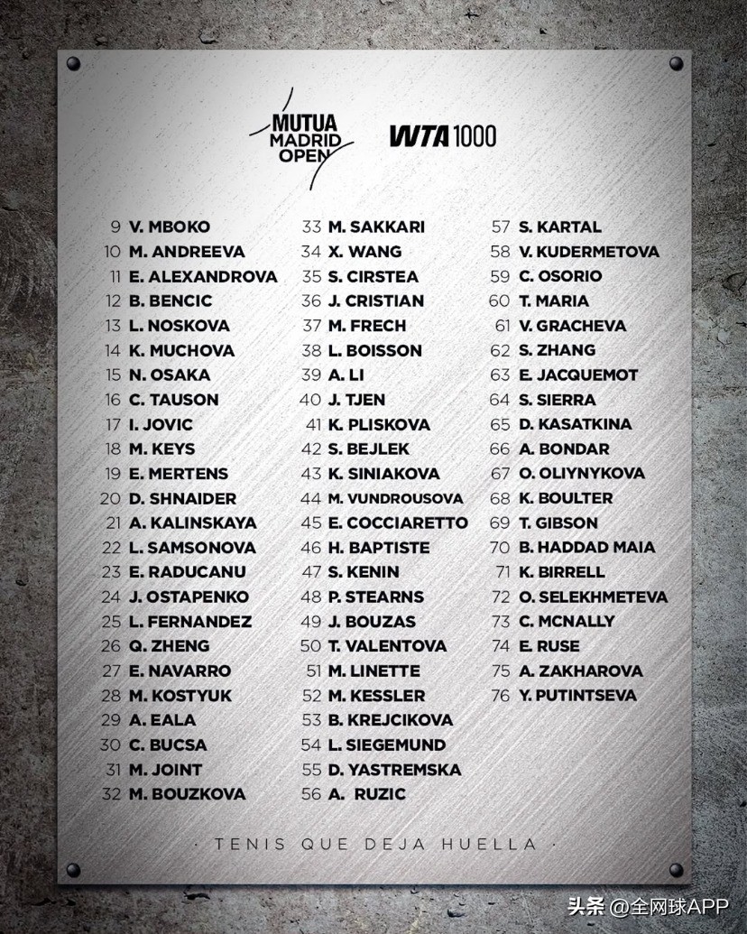 On March 31 Beijing time, the entry list for the 2026 ATP/WTA 1000 Madrid main draw was released. As the first mandatory 1000-level combined event of this year's clay season, the Madrid main draw list is star-studded, with all top 10 men's and women's singles players participating. The event will take place from April 20 to May 3, with the main draw starting on April 21.
