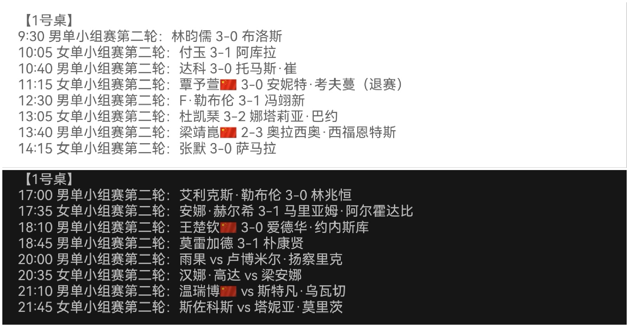 First, congratulations to Wang Chuqin and Qin Yuxuan for their opening victories, securing their first wins. Unfortunately, Liang Jingkun lost his match.