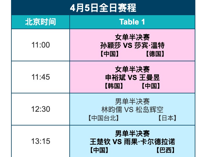 The semifinals will be held tomorrow morning, with three Chinese national team players participating. Details are shown in the image below.