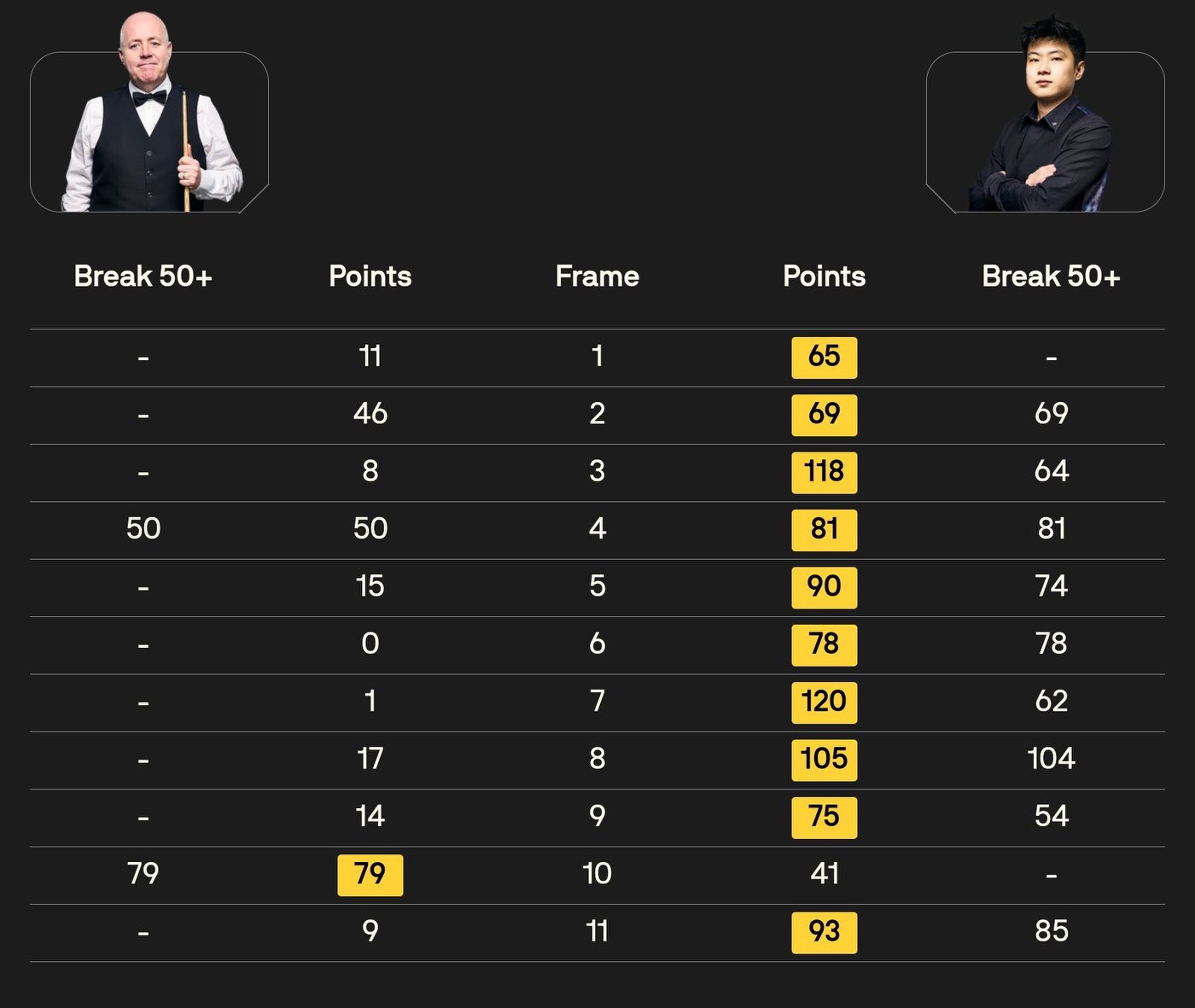 This match can be described as a complete domination. Higgins has not suffered such a lopsided defeat in recent years, which is quite frustrating and also confirms Zhao Xintong's exceptional skill, showcasing a dominant level of performance.