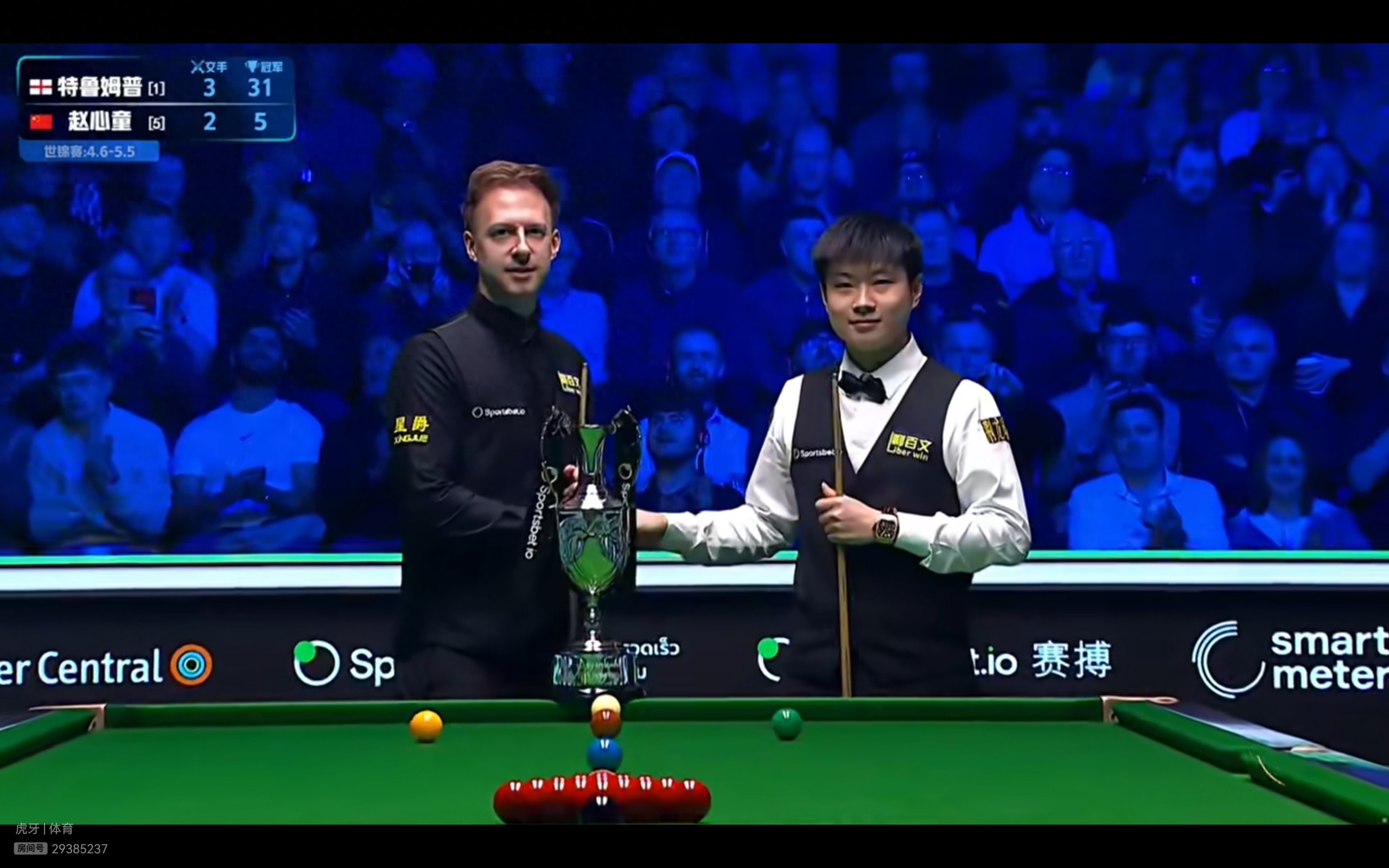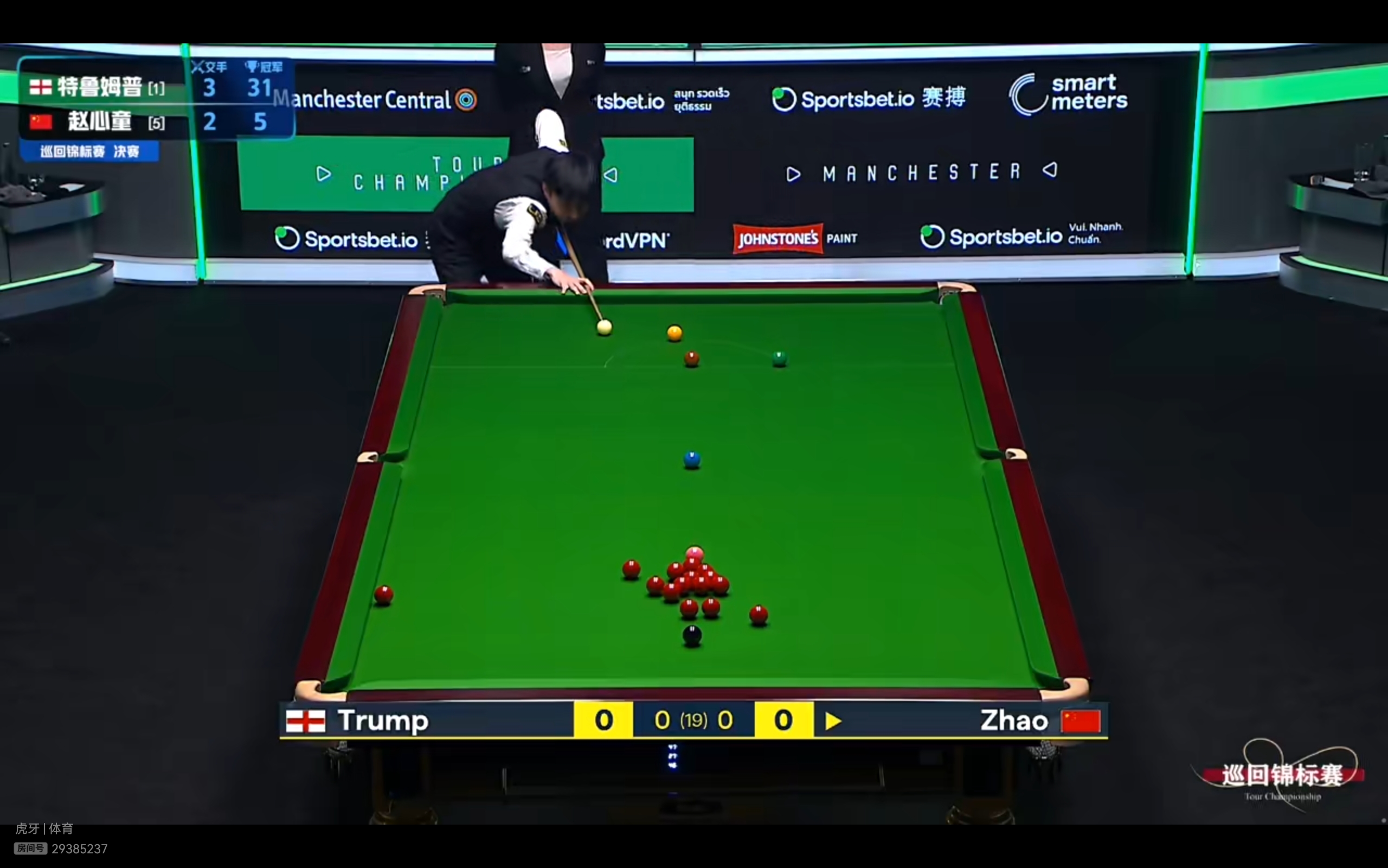 The Huya live streaming platform is providing free live coverage of the Snooker Tour Championship final between Zhao Xintong and Judd Trump.